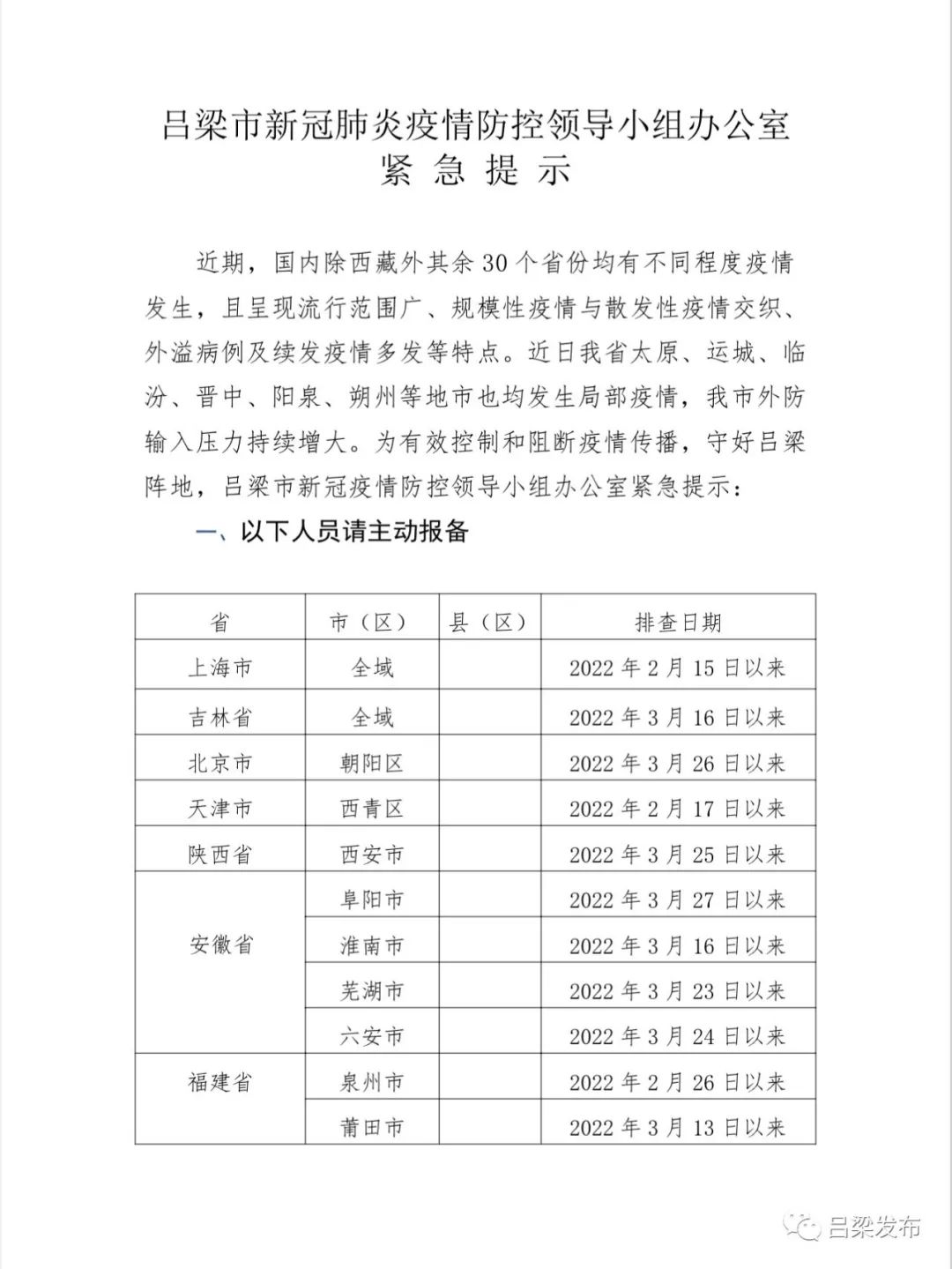 * 查詢呂梁市各區(qū)域的疫情風(fēng)險(xiǎn)等級(jí)。